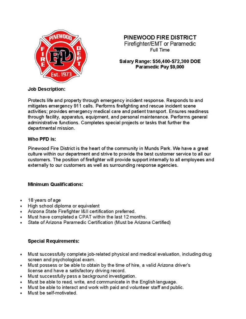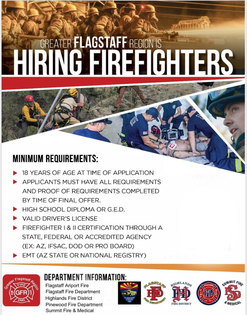 The Pinewood Fire District is a proud member of the Greater Flagstaff Regional Academy. The GFR includes: Pinewood Fire District, Highlands Fire District, Flagstaff Fire District, Flagstaff ARFF and Sumitt Fire and Medical District. Together, we recruit and train or members to the highest level. If you are interested in becoming a member of the Pinewood Fire Department, please see the job opportunities on this website or contact Captain Caleb Garcia at (928) 286-9885