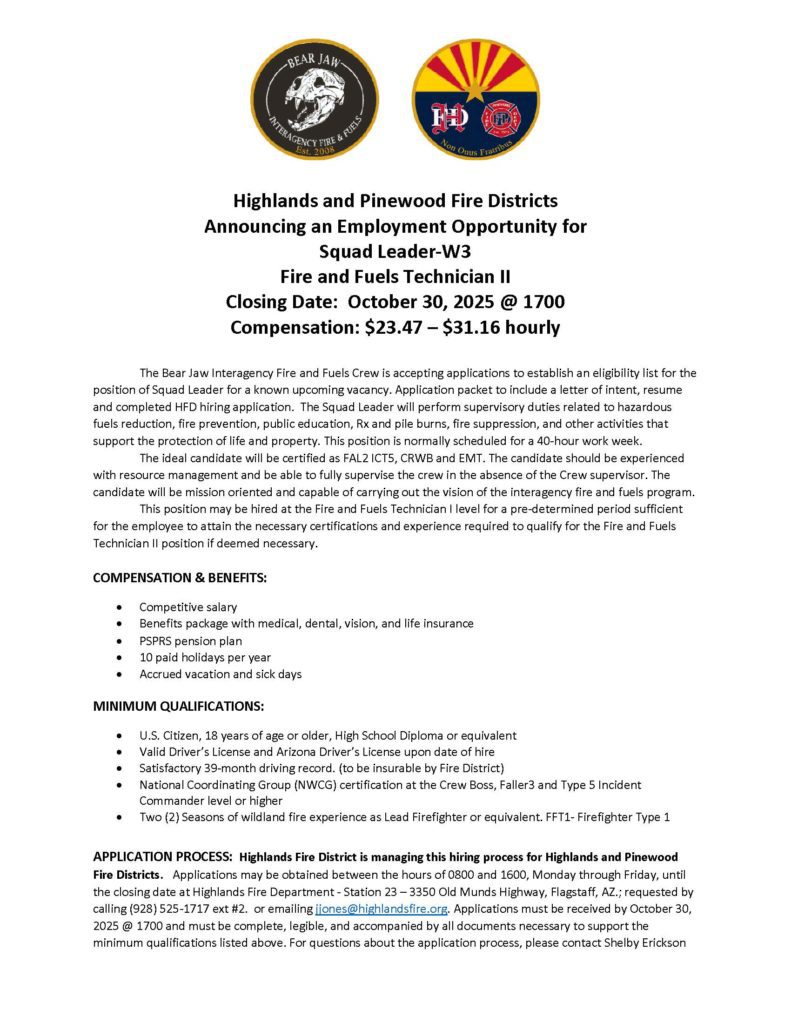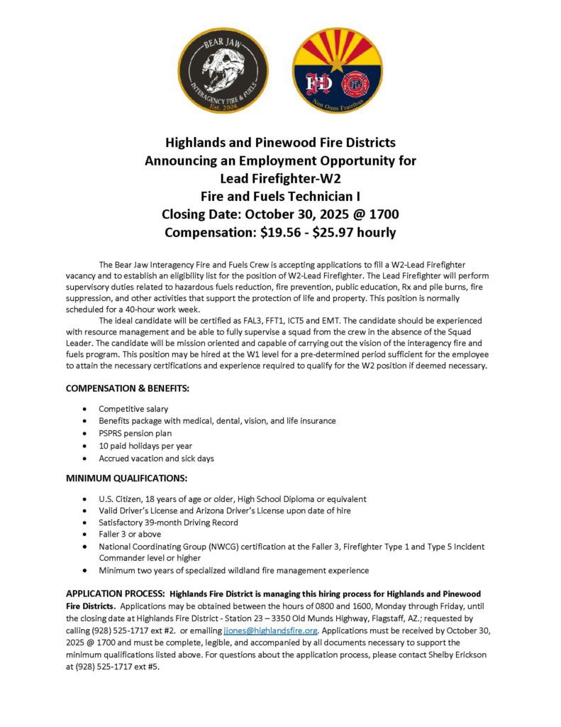 The Pinewood Fire District is a proud member of the Greater Flagstaff Regional Academy. The GFR includes: Pinewood Fire District, Highlands Fire District, Flagstaff Fire District, Flagstaff ARFF and Sumitt Fire and Medical District. Together, we recruit and train or members to the highest level. If you are interested in becoming a member of the Pinewood Fire Department, please see the job opportunities on this website or contact Captain Caleb Garcia at (928) 286-9885